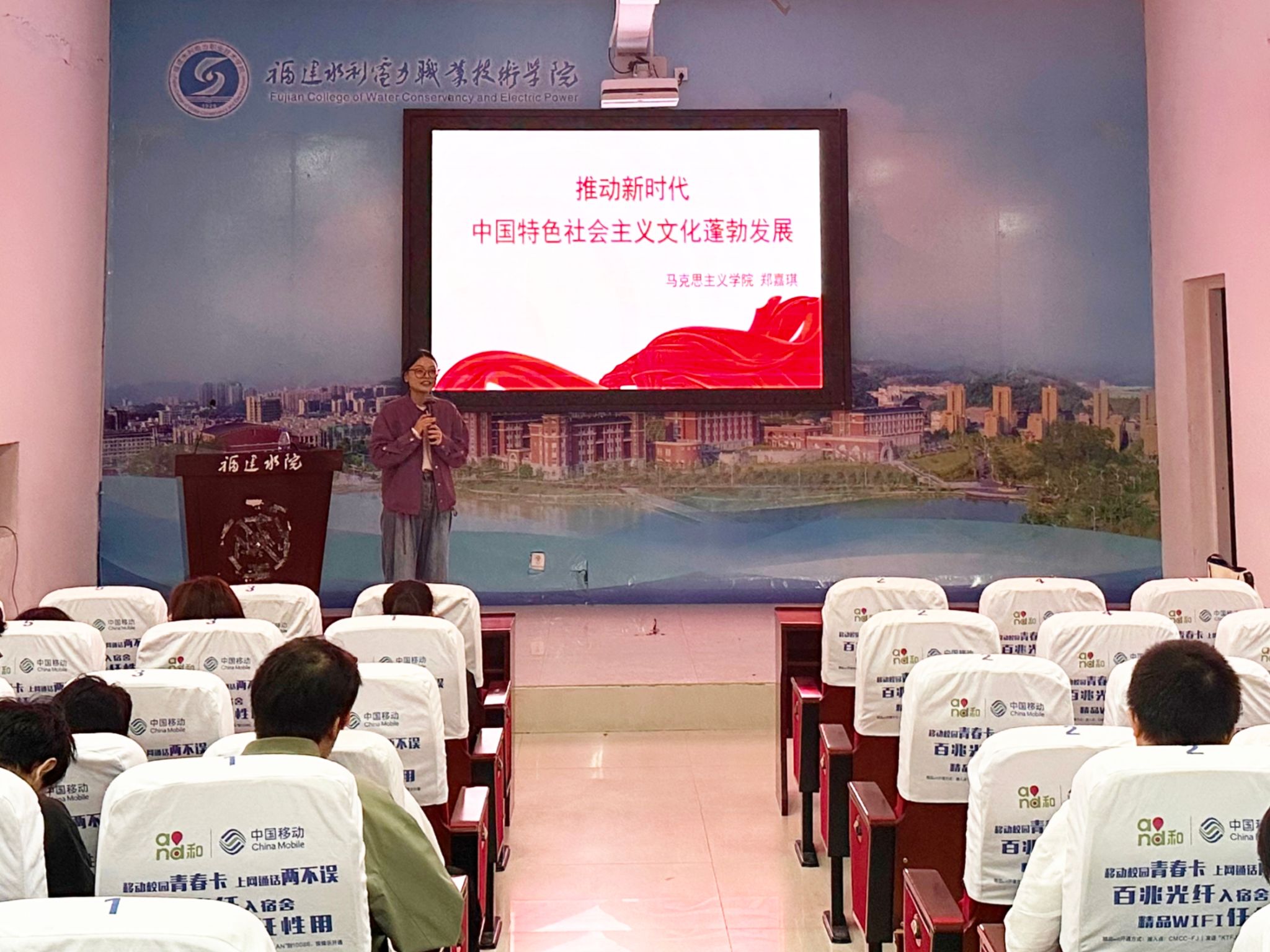 2025年10月21日晚,我院教师郑嘉琪在禹兴园3-112学术报告厅开展《推动新时代中国特色社会主义文化蓬勃发展》专题讲座,新车2431、2432、2433班级同学参加学习。