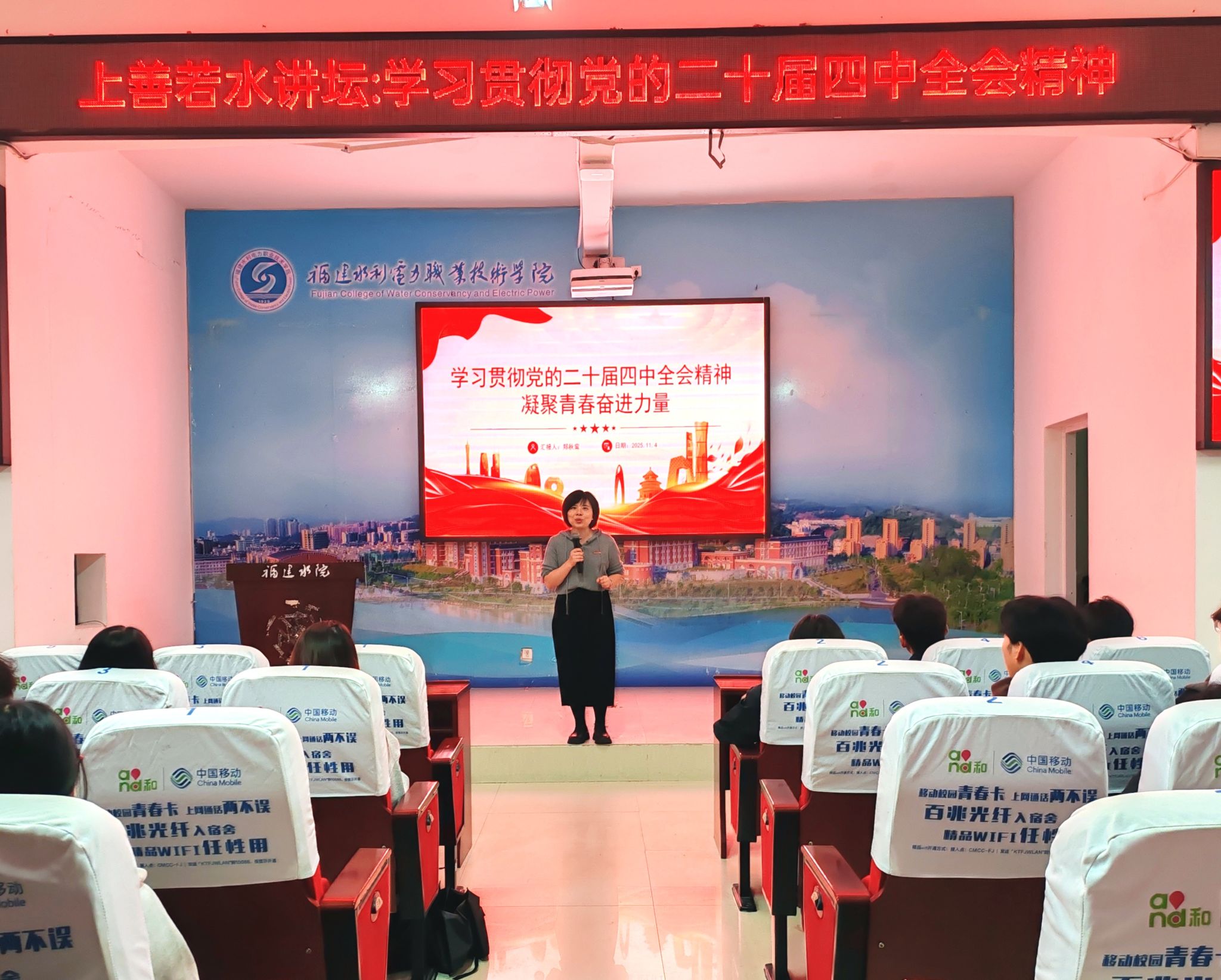 为深入学习贯彻党的二十届四中全会精神,引导广大青年学生深刻把握国家发展大势,2025年11月4日,我校在第二报告厅成功举办“上善若水”讲坛,马克思主义学院郑秋鸾老师作题为《学习贯彻党的二十届四中全会精神 凝聚青春奋进力量》的专题宣讲。本次讲坛面向高职二年级环艺2431、2432班、建筑2431、2432班学生。郑秋鸾老师通过深入浅出的解读,生动阐释了国家大政方针与职业院校学生成长发展的内在联系。
