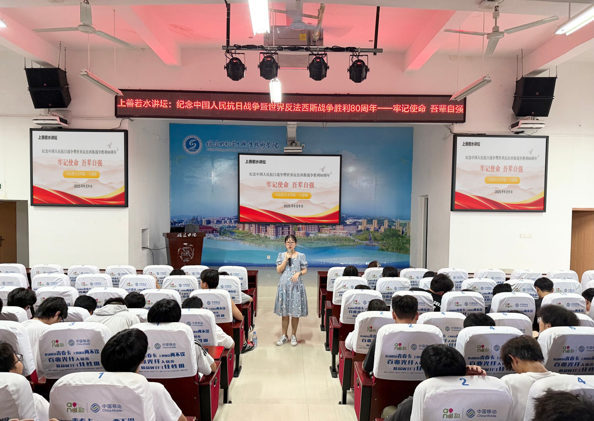 2025年9月9日,马克思主义学院王建彩老师在禹兴园3-112第二学术报告厅举办“上善若水”讲坛,主题为《纪念中国人民抗日战争暨世界反法西斯战争胜利80周年——牢记使命 吾辈自强》,近100名学生参加了讲坛。
