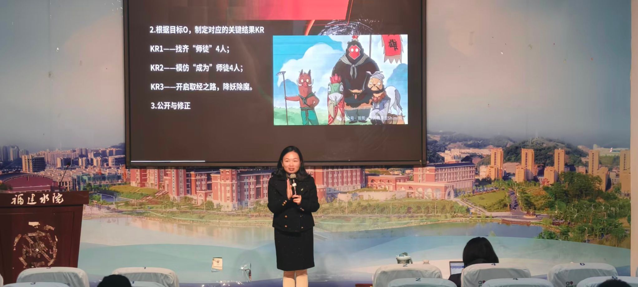 活动中,唐老师指出,不少学生常见的“升本”“考级”“考证”等目标存在冰冷、模糊的问题,难以有效落地。她结合电影《浪浪山小妖怪》的生动案例,详细拆解了OKR 制定逻辑:先确立激动人心的目标(O),再围绕目标设定可衡量的关键结果(KR),最后通过公开与修正持续优化。