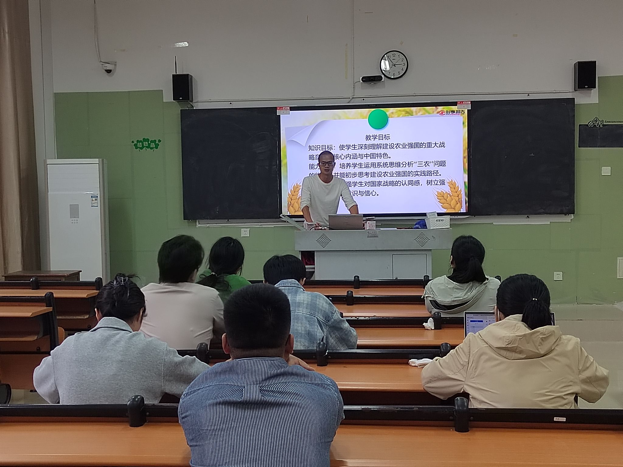 黄驹辉老师在本节课中,以“三维一体”的逻辑框架展开教学,围绕“为何要加快建设农业强国”“要建设什么样的农业强国”以及“怎样加快建设农业强国”三大核心问题,层层递进,引导学生展开系统性思考。在导入环节,通过呈现2024年我国粮食产量再创新高、农村居民收入增速持续领跑等关键数据,生动阐释了“三农”作为大国经济“压舱石”的坚实基础,有效点燃了学生的思考热情。在教学核心环节,黄老师巧妙运用系统化思维导图,将原本抽象的理论框架可视化,清晰呈现农业强国的共同特征与中国特色的内在联系,深刻阐释了“普遍规律”与“中国路径”之间的辩证统一。针对“大国小农”这一基本国情,课堂还组织了深入的小组研讨,学生在思想碰撞中共同探索中国特色农业现代化道路的实践方向,进一步增强了理论认同与道路自信。
