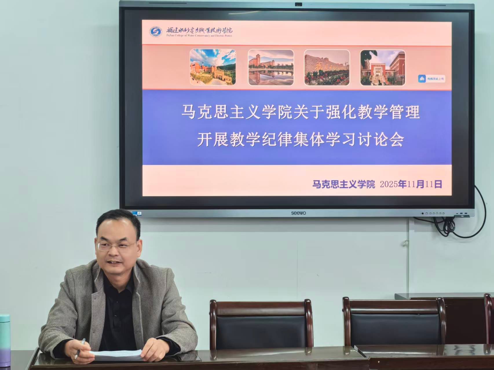 为深入学习贯彻学校《关于强化教学管理、开展教学纪律学习的通知》,将师德师风建设内化于教学管理的全过程,2025年11月11日下午,马克思主义学院在禹兴园7-535组织召开“强化教学管理、严肃教学纪律”专题学习会。本次会议不仅是一次教学规范的集中学习,更是一堂生动的师德师风现场教育课,马院教师齐聚一堂,共研教学纪律,共话师德初心。
