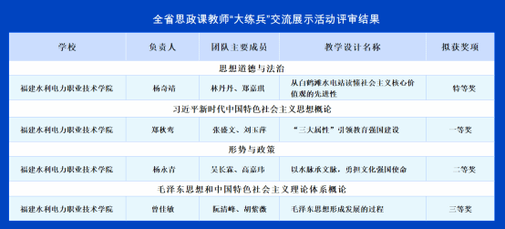 近日,福建省教育厅公布2025年全省思政课教师“大练兵”交流展示活动评审结果。学校马克思主义学院教师表现出色,获得特等奖、一等奖、二等奖、三等奖各一项,获奖成绩位列全省高职院校前列。