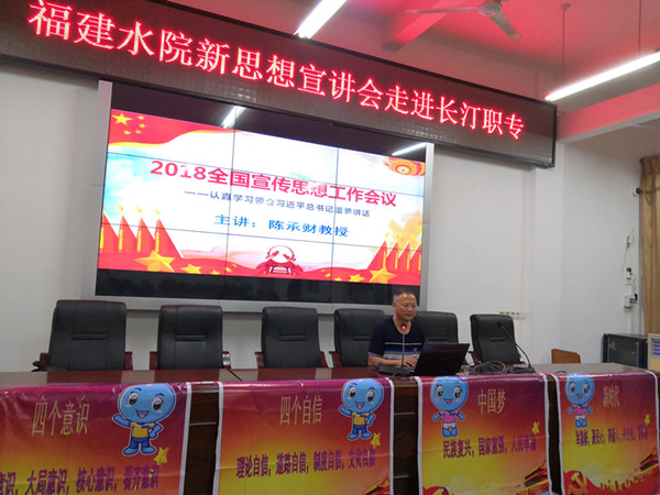 10月8日,我院学生思政实践队在马克思主义学院专兼职思政教师的带领下走进长汀职专,当晚举行了一场别开生面的新思想宣讲活动。马克思主义学院陈承财教授作了一场2018全国宣传思想工作会议精神学习讲座,结合当前思想政治工作新形势,提出新时代青年要扣好人生第一粒扣子,筑牢理想信念,学习先进模范,自觉抵制网络中的低俗庸俗媚俗。敢于讴歌党、讴歌祖国、讴歌人民、讴歌英雄,承担起举旗帜、聚民心、育新人、兴文化、展形象的使命任务。