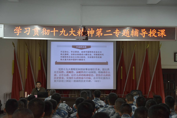 讲座以中华民族伟大复兴梦为主线,共分为寻梦——历史和人民中国共产党、追梦——中国共产党领导人民取得伟大胜利、圆梦——用新思想引领新时代,开启新征程三个篇章。张盛文教授通过讲述党的发展历程,感召全体官兵坚定马克思主义信仰,坚定实现中华民族伟大复兴梦的理想信念。同时他运用翔实的数据、经典的案例、生动的语言从深刻把握党的十九大的主题、主要成果,全面认识中国特色社会主义进入新时代,深入领会习近平新时代中国特色社会主义思想等方面对党的十九大精神作了全面系统的讲解。