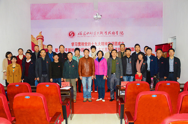 12月1日下午,学院学习贯彻十九大精神宣讲团成立大会暨习近平新时代中国特色社会主义思想读书社揭牌授旗仪式在学术报告厅举行。参会人员有学院党委副书记黄瑞梅老师、学院党委委员、副院长杨武盖老师以及党工部、党政办、教务处、学工处、纪检监察处、图书馆、各系部、各党总支、团委、马克思主义学院等部门的领导和老师,读书社全体学生成员。会议由马克思主义学院院长张盛文老师主持。