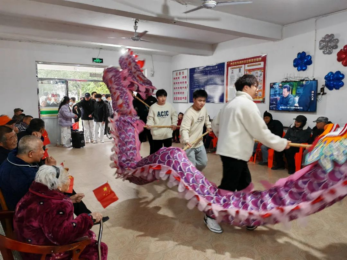 同学们为老人们带来了精彩的舞龙表演、合唱《歌唱祖国》以及闽南歌曲《爱拼才会赢》,老人们看得目不转睛,不时发出阵阵掌声,并与同学们一起高歌。随后,伴随着轻快的歌曲,大伙围着老人做起了手指操,老人们也有样学样活络起了手指头。活动还为老人分发了精心准备的小零食,老人们就像小孩子般笑得开心。新年即将来临,同学们也借此机会为老人们贴上了窗花,希望他们开开心心过冬至,健健康康迎新年。