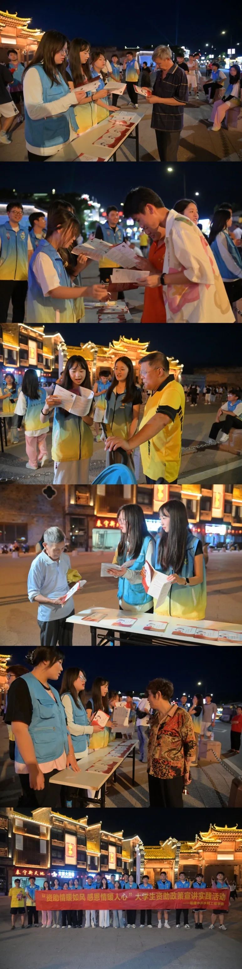 7月14日晚上,实践队一行来到泰宁县城中心,在热闹的市民活动广场开展资助政策宣传活动。活动现场,宣讲团成员们热情洋溢地向市民们详细介绍了国家和学校现行的各项资助政策。宣讲内容涵盖了助学金、奖学金、助学贷款等多个方面,实践队成员们还结合水利工程学院的特色,分享了学院在资助工作方面的典型案例和成功经验。这些生动的实例不仅增强了宣讲内容的丰富性,更激发了市民群众的浓厚兴趣。