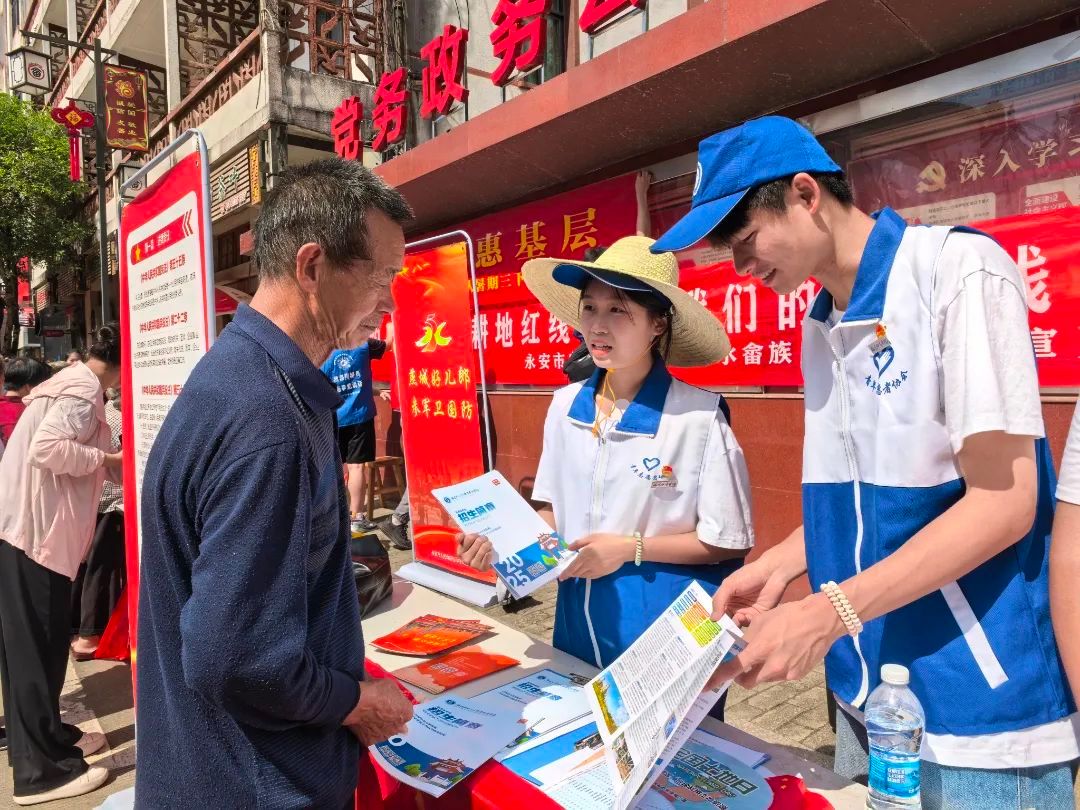 立足专业优势与地方需求,实践队在集镇与学校开展了系列志愿服务活动,将知识与温暖送到群众身边。在青水畲族乡集镇,队员们化身“政策宣传员”,向村民推广普通话,细致宣讲三农政策与高校资助政策;结合专业特色,生动介绍AI数字技术在农业生产、生活服务中的应用,用通俗语言让村民感受科技赋能乡村的潜力,现场互动频繁,咨询踊跃。