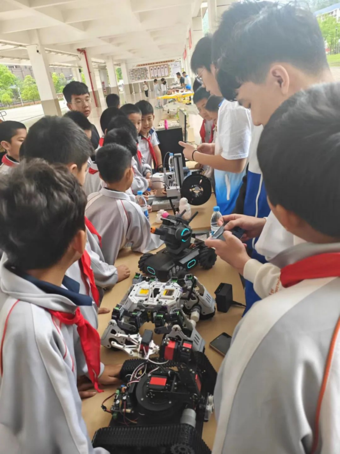 活动分两部分进行。一组现场演示“履带机械手机器人”与“麦克纳姆轮机器人”,表演立地行走、抓取物品等,小朋友们在互动中也体验到了机器人的科技魅力;二组通过多媒体视频播放的形式,向小朋友们普及科技知识,如机器人原理、编程基础、科技创新案例等。