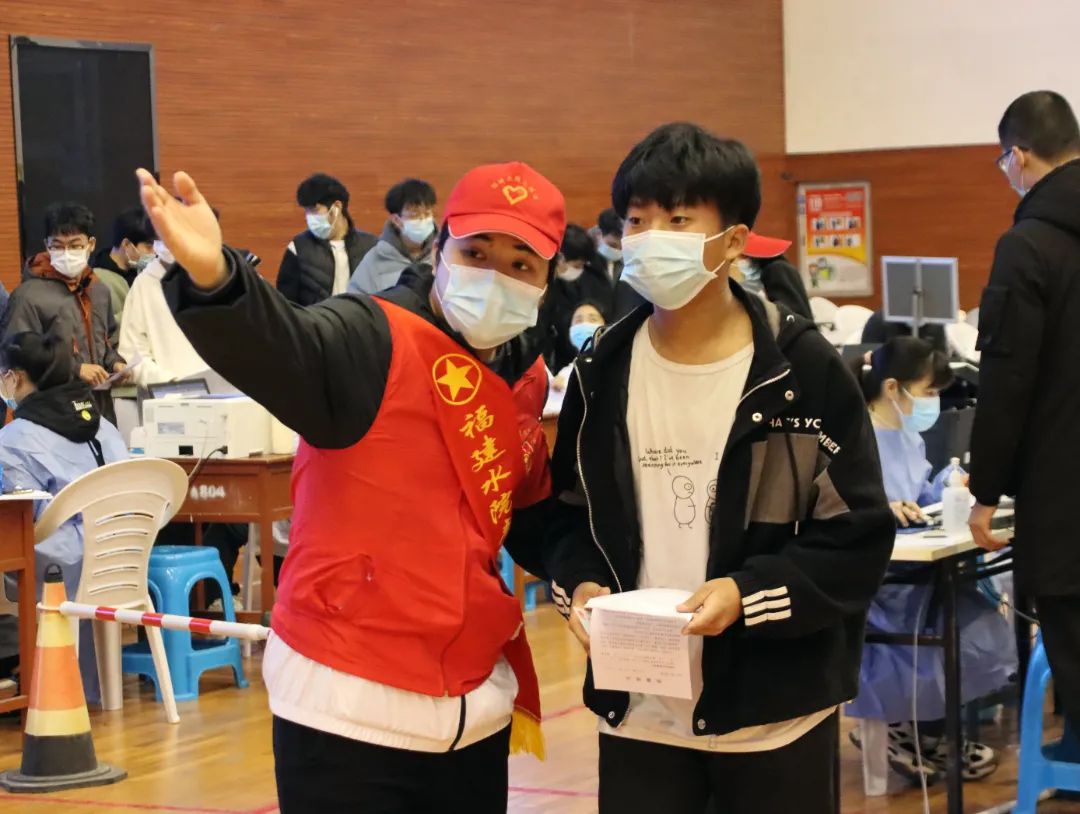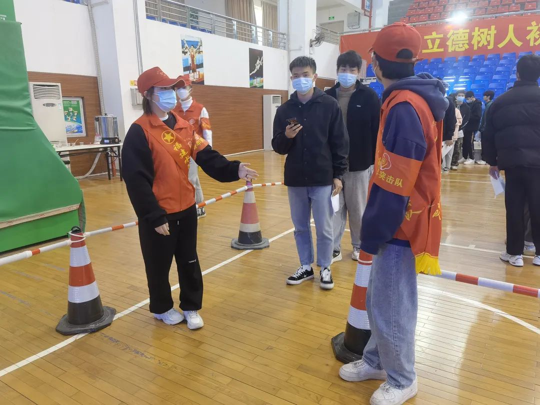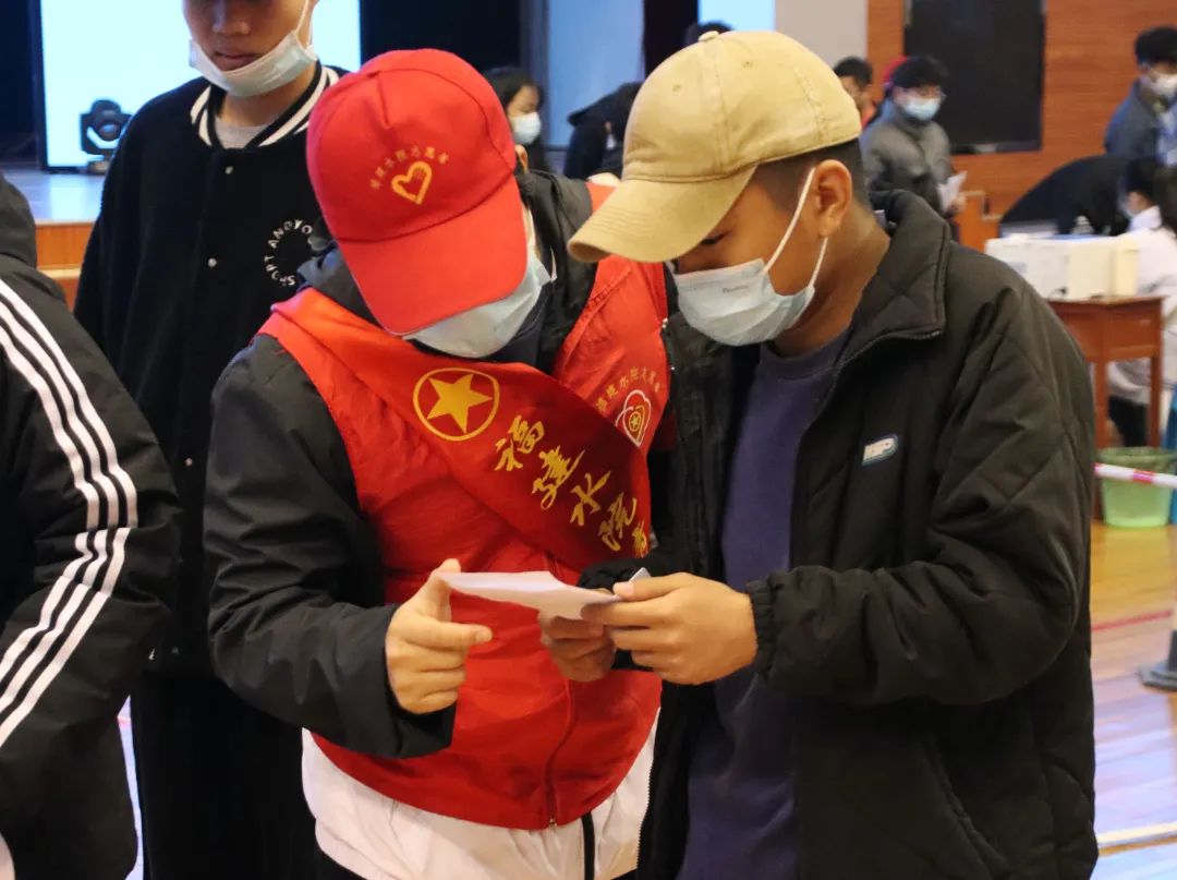 学院青年突击队和红十字会的志愿者们,帮助师生们进行信息登记,告知其相关注意事项,维护现场秩序,为同学们提供温暖服务。