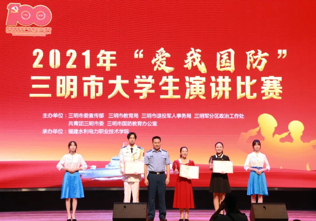 10月15日下午,2021年“爱我国防”三明市大学生演讲比赛在福建水利电力职业技术学院路港体育馆举行,全市3所高校的9组选手展开了激烈的角逐,他们以“迈向强国新征程 军民共筑强军梦”为主题,声情并茂地表达了新时代青年强化国防观念、提高军事素质、用实际行动点燃强军梦想的价值追求。