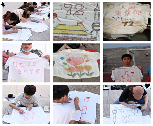“画笔绘祖国,延展华美中国梦;衷心献祖国,成就熠熠中国魂;赤胆报祖国,坚定热血中国心。”活动中,指导老师李大双和社员们将对祖国的无限热爱绘画在白色T恤上,将一句句铿锵有力的爱国誓言写在胸前。
