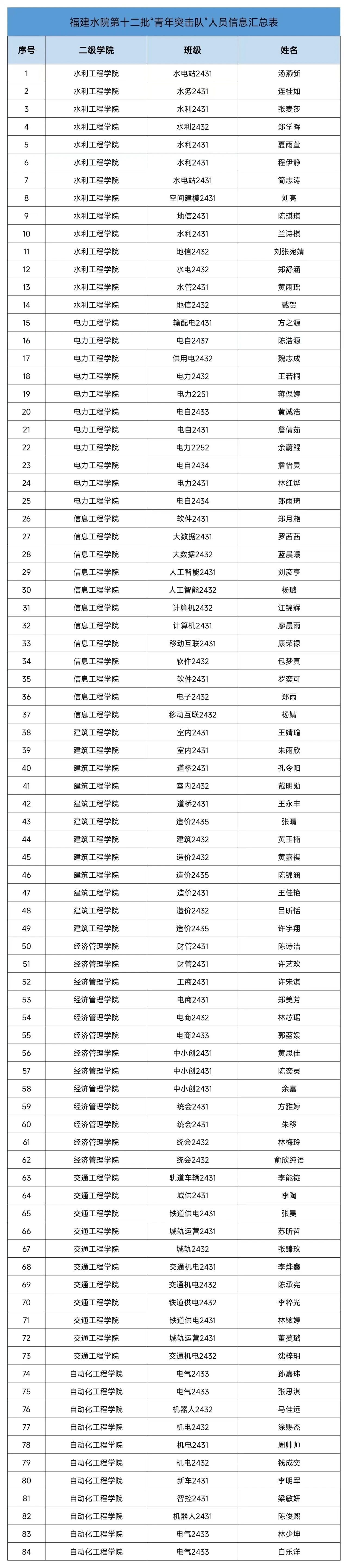 为充分发挥团员青年的生力军作用,我校持续组织引导团员青年们在学习实践中脚踏实地、练就本领,甘于奉献、担当作为 。新学期,为切实保障学校各项活动顺利有序开展,凝聚学校青年力量,团委研究决定向各学院及校级学生组织招募“青年突击队”第十二批成员。经各二级学院组织报名推荐,校团委审核,学校“青年突击队”第十二批成员名单现正式公布。
