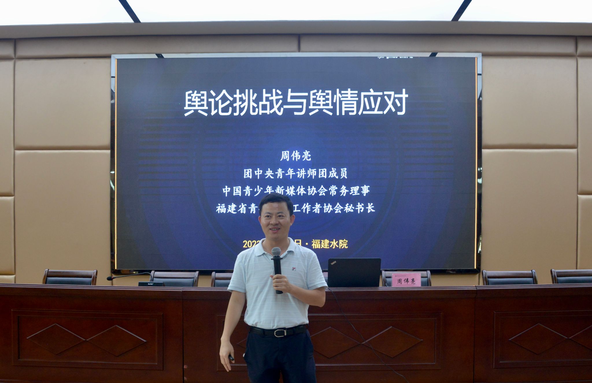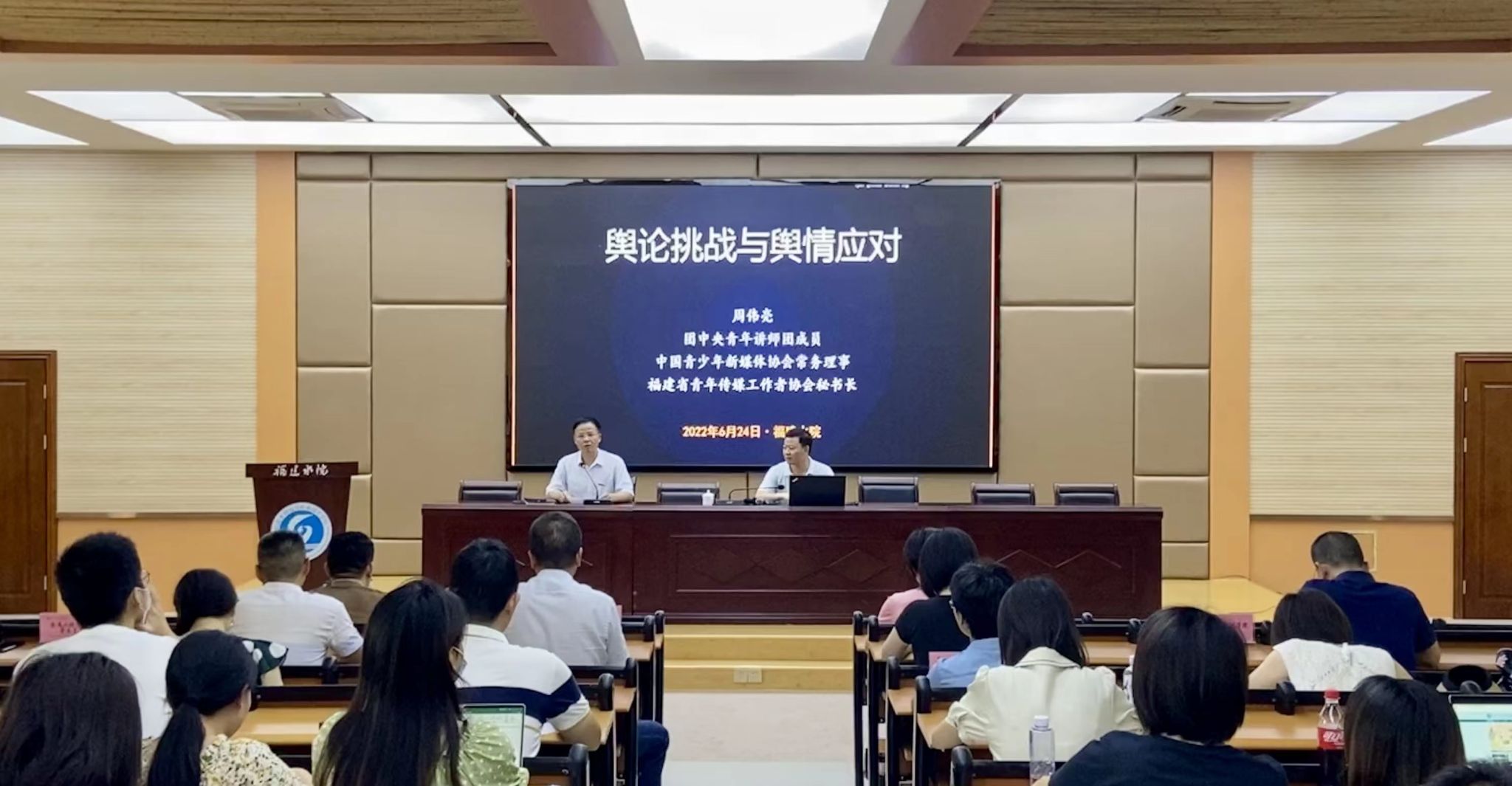 6月24日下午,学院在第一学术报告厅开展“舆论挑战与舆情应对”专题讲座,特邀团中央青年讲师团成员、团省委宣传部副部长周伟亮主讲。学院党委副书记黄瑞梅,有关部门负责人及工作人员,全体思政课教师、专职辅导员到场聆听。讲座由宣传部(统战部)部长刘华斌主持。