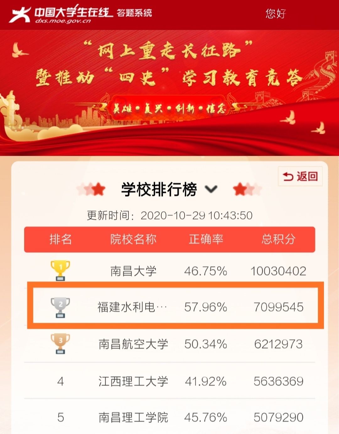 在线上,以“中国大学生在线”平台为主阵地,拉开了全体师生“四史”大学习的序幕。学院从动员环节就充分激发了广大师生的学习积极性,无论是学院领导,还是普通师生,一直热情高涨。每一个分数背后都是对“四史”多一分的了解,感受到红军长征路上每一个感人的故事,体会到新中国成立以来社会主义事业发展的伟大实践历程。在学习打卡中大家深刻认识到中华民族“从哪里来,要到哪里去”,自觉强化“不忘初心,牢记使命”的责任担当。10月21日至发稿前,全院师生累计15000余人参加线上答题,总分位列全国第二名、全省第一名,有50余名入榜全国500强,并始终保持较高的答题准确率。