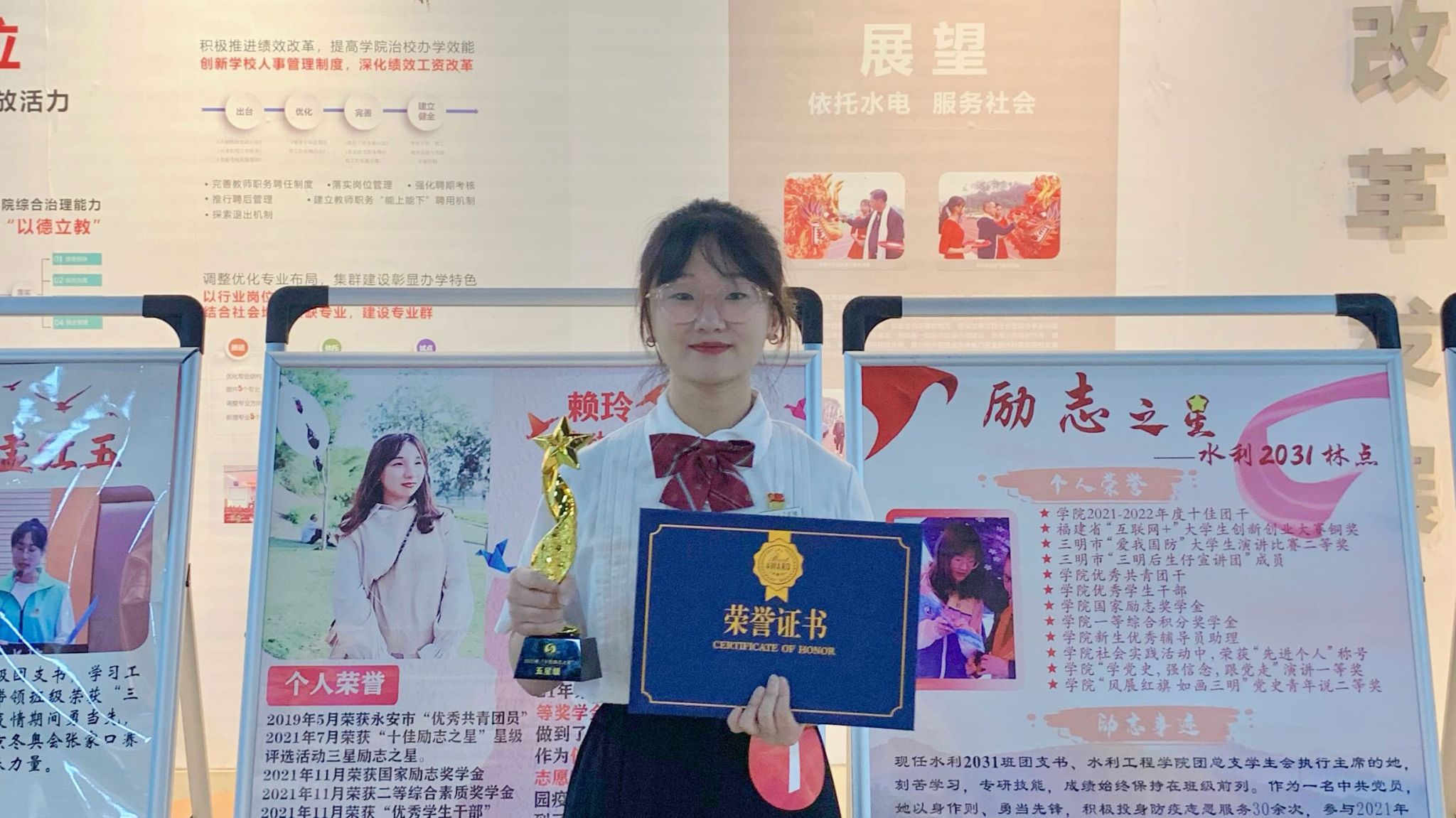 在校期间,她累计获奖40余项,曾获2021年度“永安市优秀共青团员”、学校2021-2022年度“十佳优秀团干”、2022年十佳励志之星星级评选活动“五星励志之星”、2021-2022学年“三好学生”、福建省“美丽乡村直播挑战赛”银奖、连续两年获得福建省“互联网+”大学生创新创业大赛铜奖、国家励志奖学金、优秀学生干部、优秀团干等多项荣誉,被学校授予“优秀毕业生”荣誉称号。