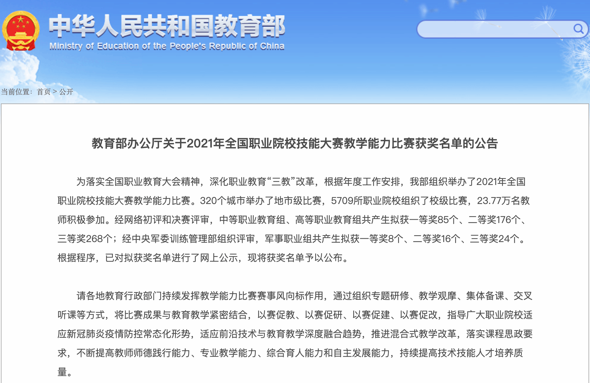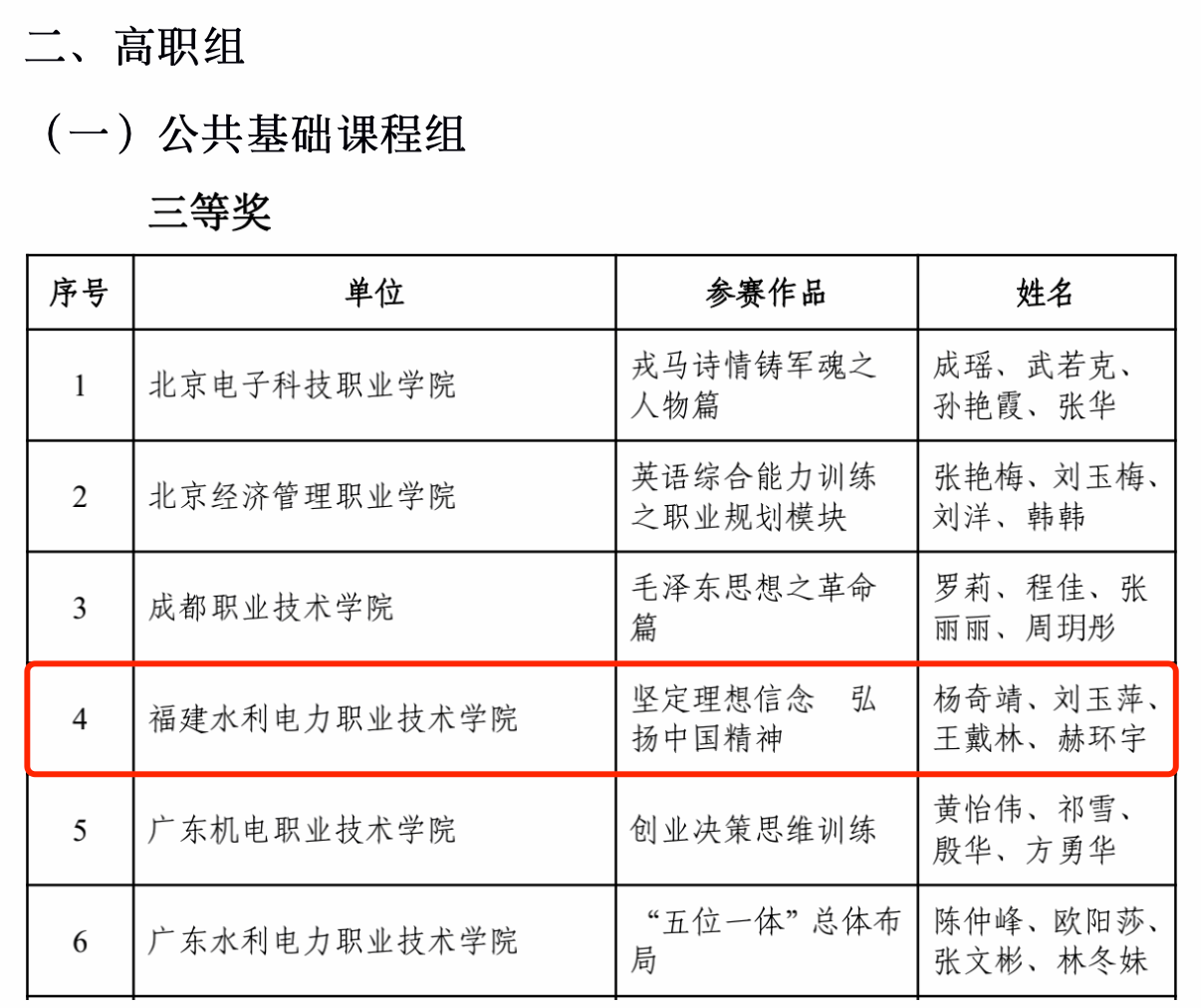 近日,教育部办公厅发布了《关于2021年全国职业院校技能大赛教学能力比赛获奖名单的公告》,我院教师杨奇靖、刘玉萍、王戴林、赫环宇教学团队作品《坚定理想信念弘扬中国精神》荣获高职组公共基础课程三等奖。