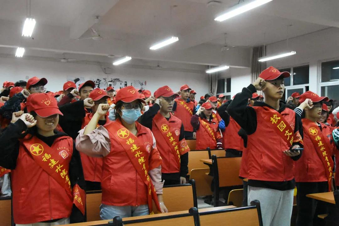 最后,突击队全体成员在队长张小楠的带领下,高举右手,庄严宣誓:我志愿成为一名光荣的创文志愿者,我承诺:我将尽己所能、服从安排、不计报酬、真诚服务、以身作则、遵德守礼,倡导校园文明新风尚,秉承“精求技能 崇尚文明”的校训,做文明有礼的水院人,以实际行动为学院创建文明校园贡献青春力量。