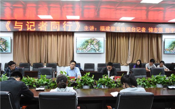 4月17日晚,福建教育电视台资深记者储志强、陈宇到我院开设《与记者同行》专题讲座。学院各部门通讯员、各网络文化工作室指导老师及学生代表共40余人到场聆听。讲座由党委工作部副部长林灿东主持。