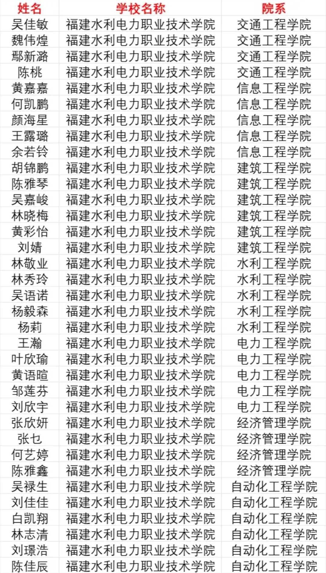 福建水利电力职业技术学院国家奖学金获奖学生名单