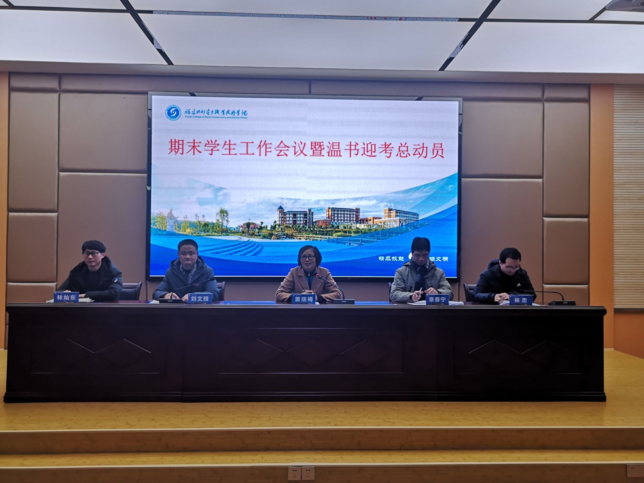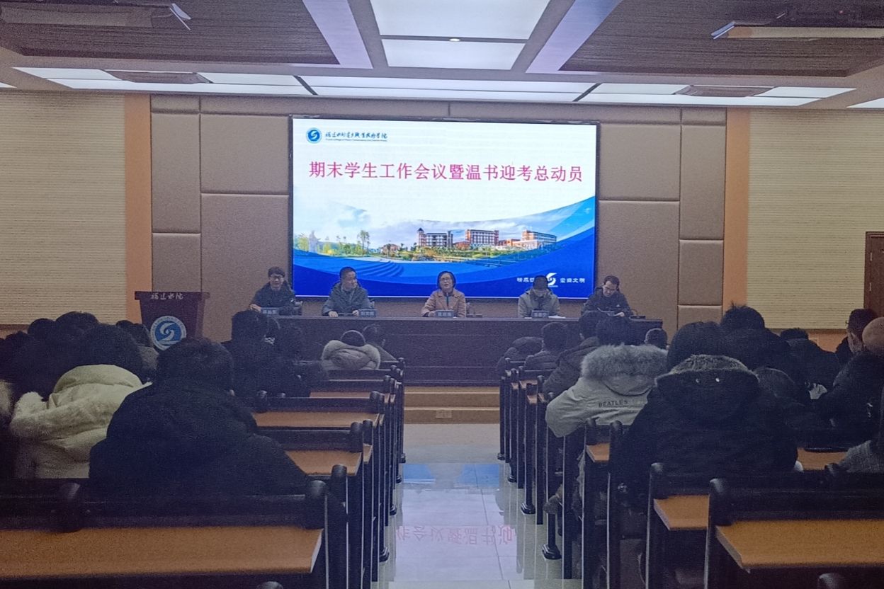 12月30日晚,学院在第一学术报告厅召开期末学生工作暨温书迎考总动员会。学院党委副书记黄瑞梅、学生工作部、后勤处、安全保卫处、各系党团总支负责人及全体专兼职辅导员出席会议。