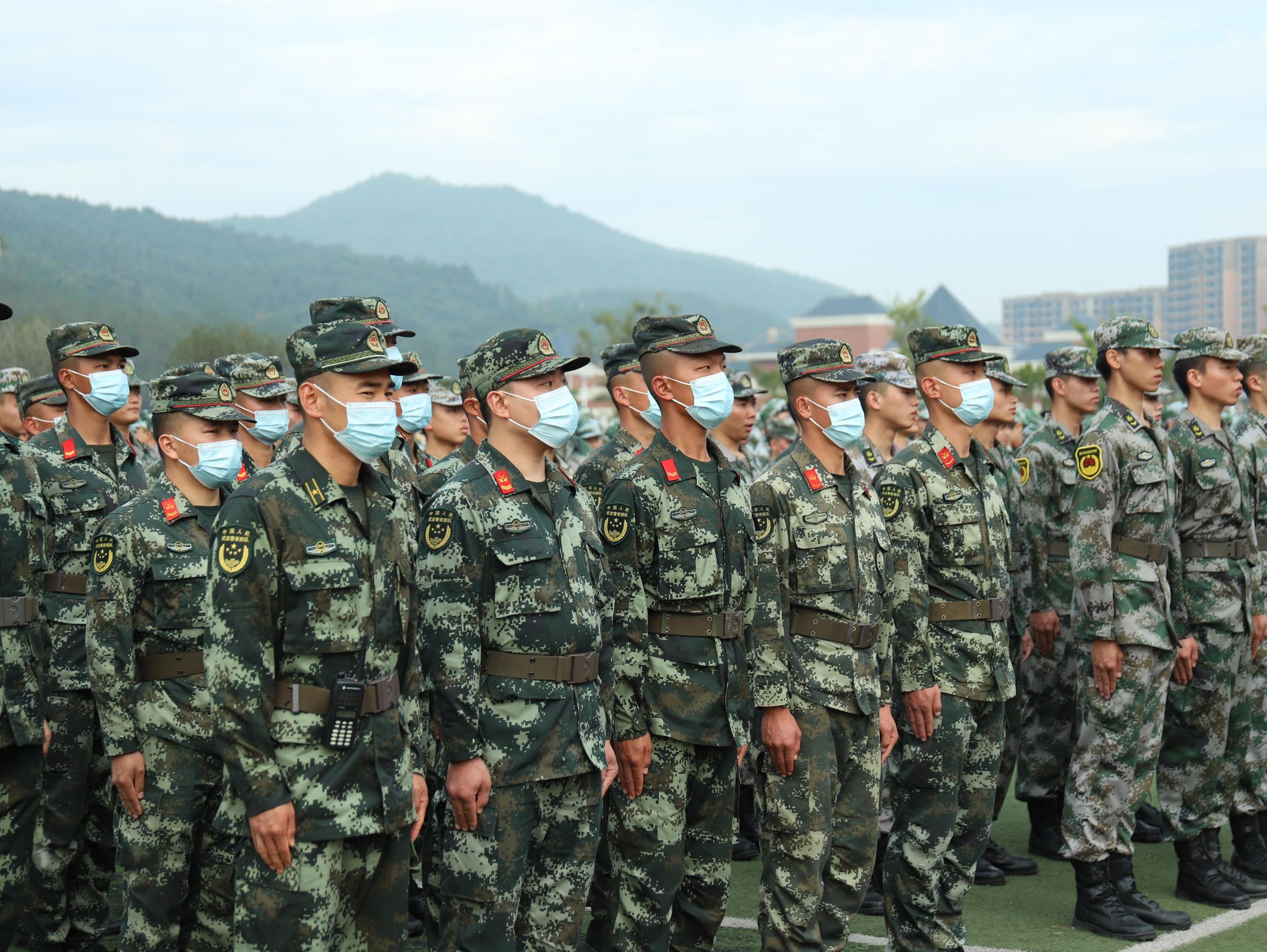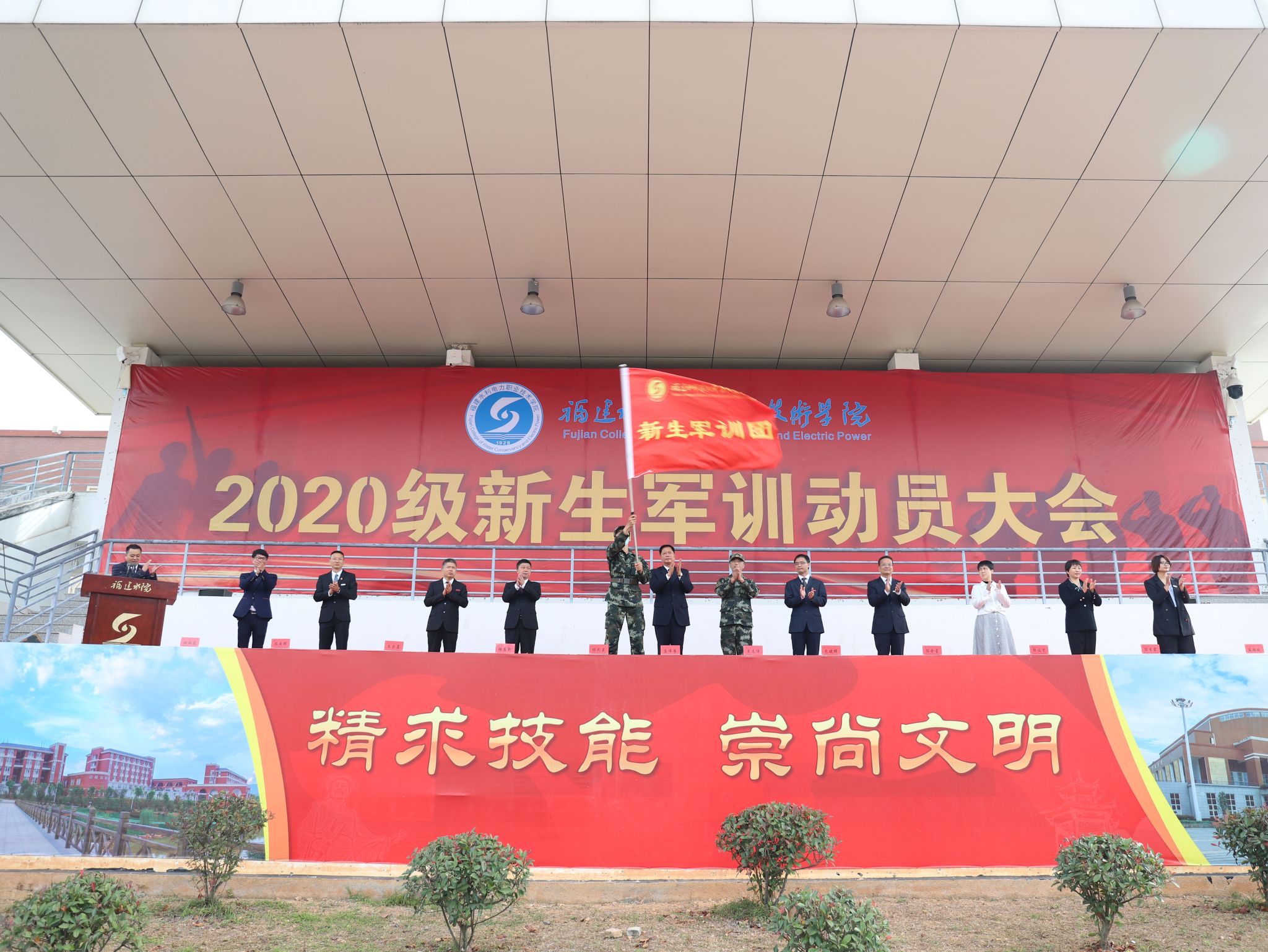 随后,他为2020级新生军训团授旗,承训部队代表上台接旗。