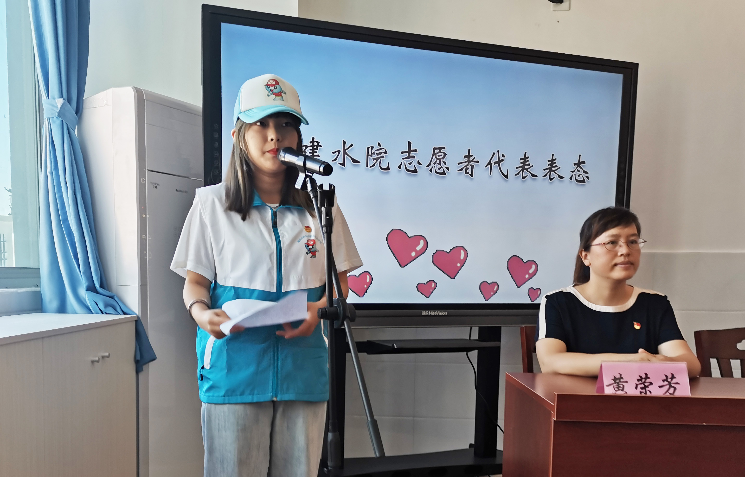 在全体奏唱团歌后,庄娟瑜在启动仪式上讲话,并介绍了此次“三下乡”的活动安排。她指出,本次活动主要围绕爱党爱国、感恩孝亲、卫生健康、安全自护、快乐阅读、科技实践、节能环保7个模块设计安排,旨在通过这些活动引导帮助农村留守儿童和城市随迁子女开拓视野,拓展素质,树立自信,养成良好的行为习惯。送人玫瑰,手留余香,庄娟瑜真诚地期望志愿者们能给孩子们带来欢乐、知识和梦想,度过一个快乐而充实的暑假。随后,学生志愿者代表在现场进行了宣誓并表态。