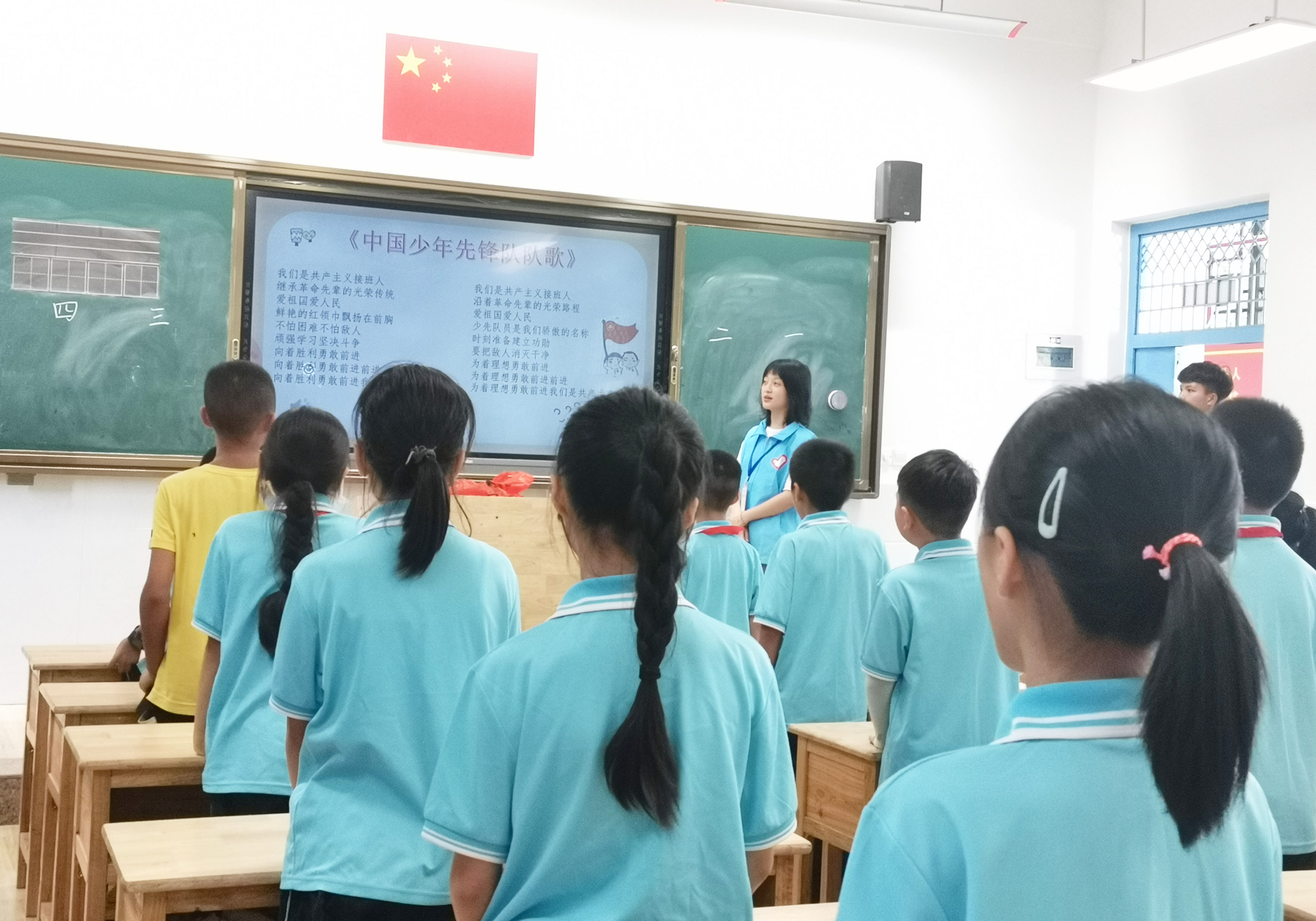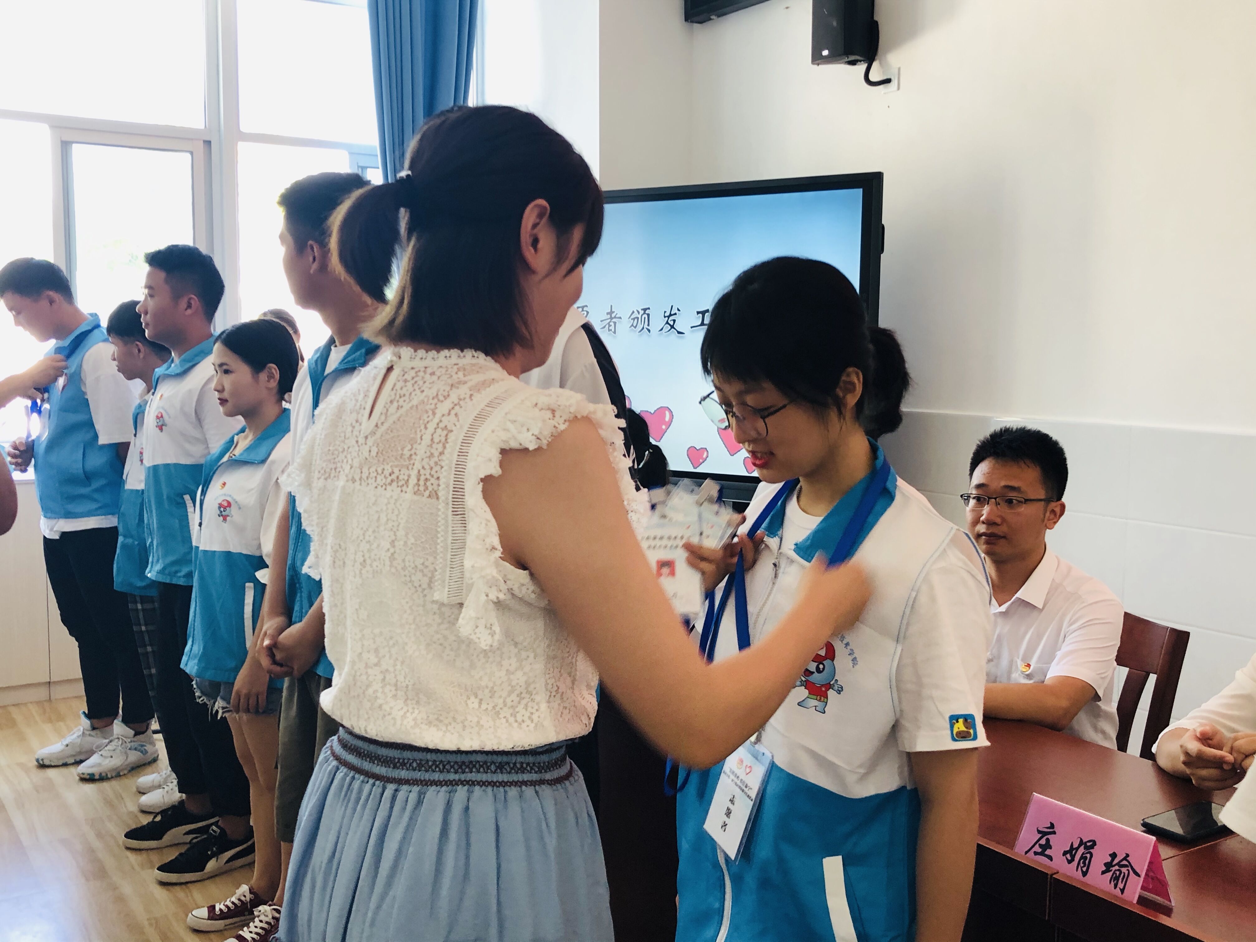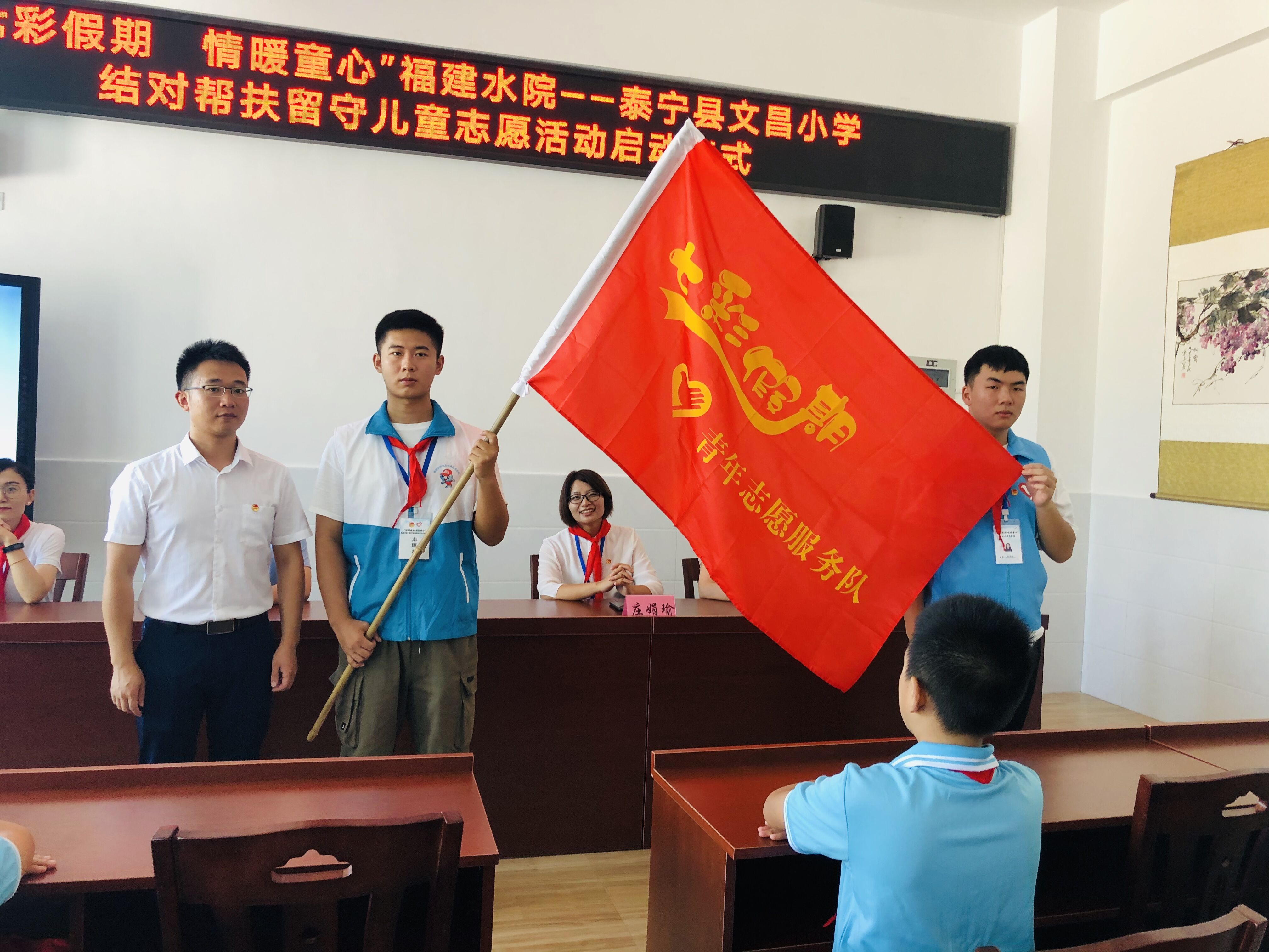 邹为坤给志愿者们颁发工作证并授旗,10名留守儿童代表为志愿者们献戴红领巾。邹为坤对福建水院对此次活动的大力支持表示衷心的感谢,他表示,暑期“三下乡”活动是我们大学生走进社会、了解社会、服务社会的平台,希望两校可以友好合作,牵上友谊之手,队员们能跟学生们建立良好的关系,课上良师课下益友,为小学生们带来开阔视野的平台,并预祝本次暑期三下乡活动圆满成功。