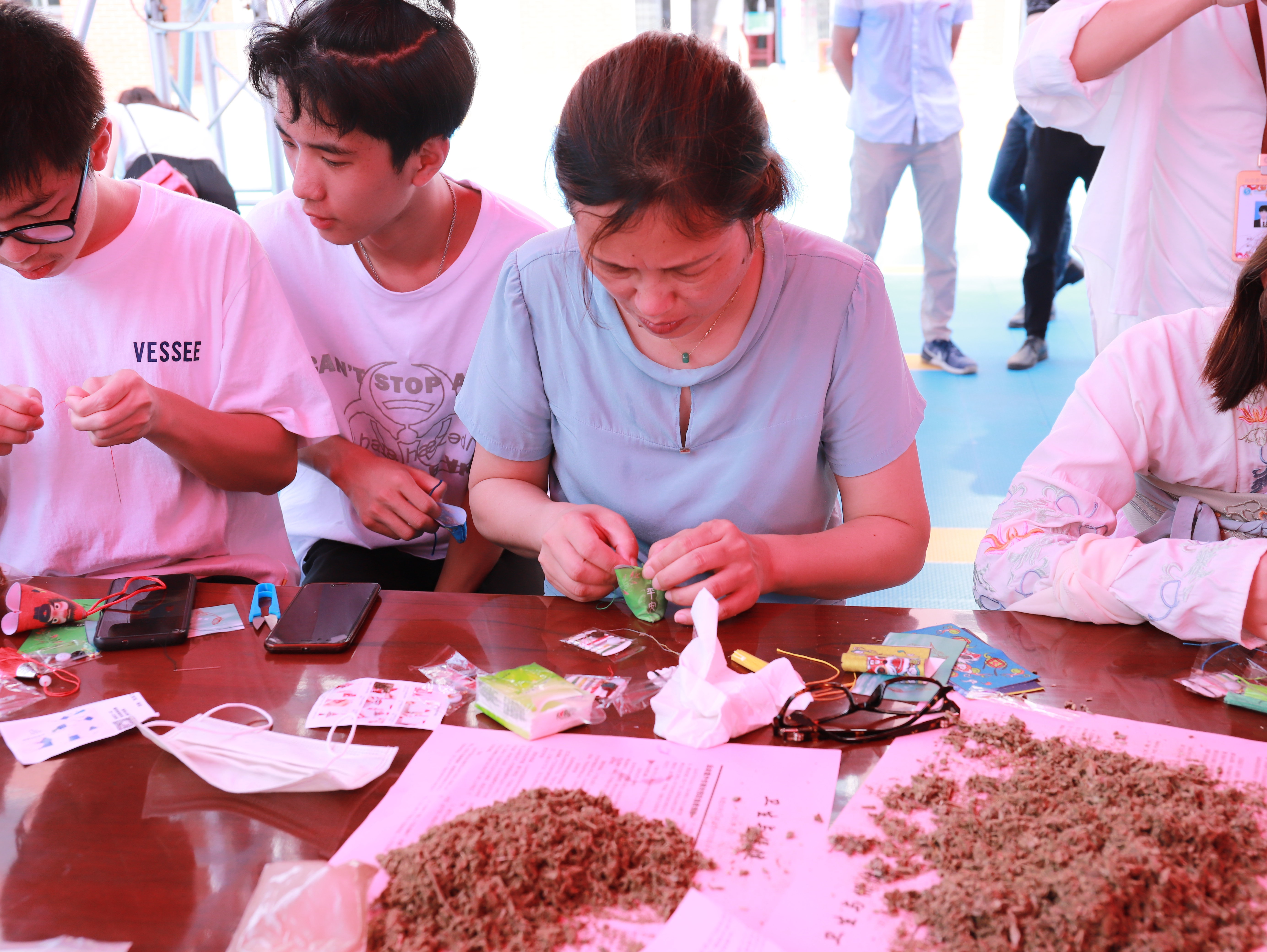 浓郁飘香的粽叶糯米,熙攘喧闹的人群,仿佛一个播撒着美食和欢乐的乐园,大家其乐融融,四处充满了欢声笑语。师生们齐聚一堂,体验“端午粽香”包粽子DIY、“端午安康”香囊DIY、“端午童趣”蛋兜DIY、“端午龙舟”旱地龙舟PK赛等一系列活动带来的乐趣,欢度了一个热热闹闹的端午节。