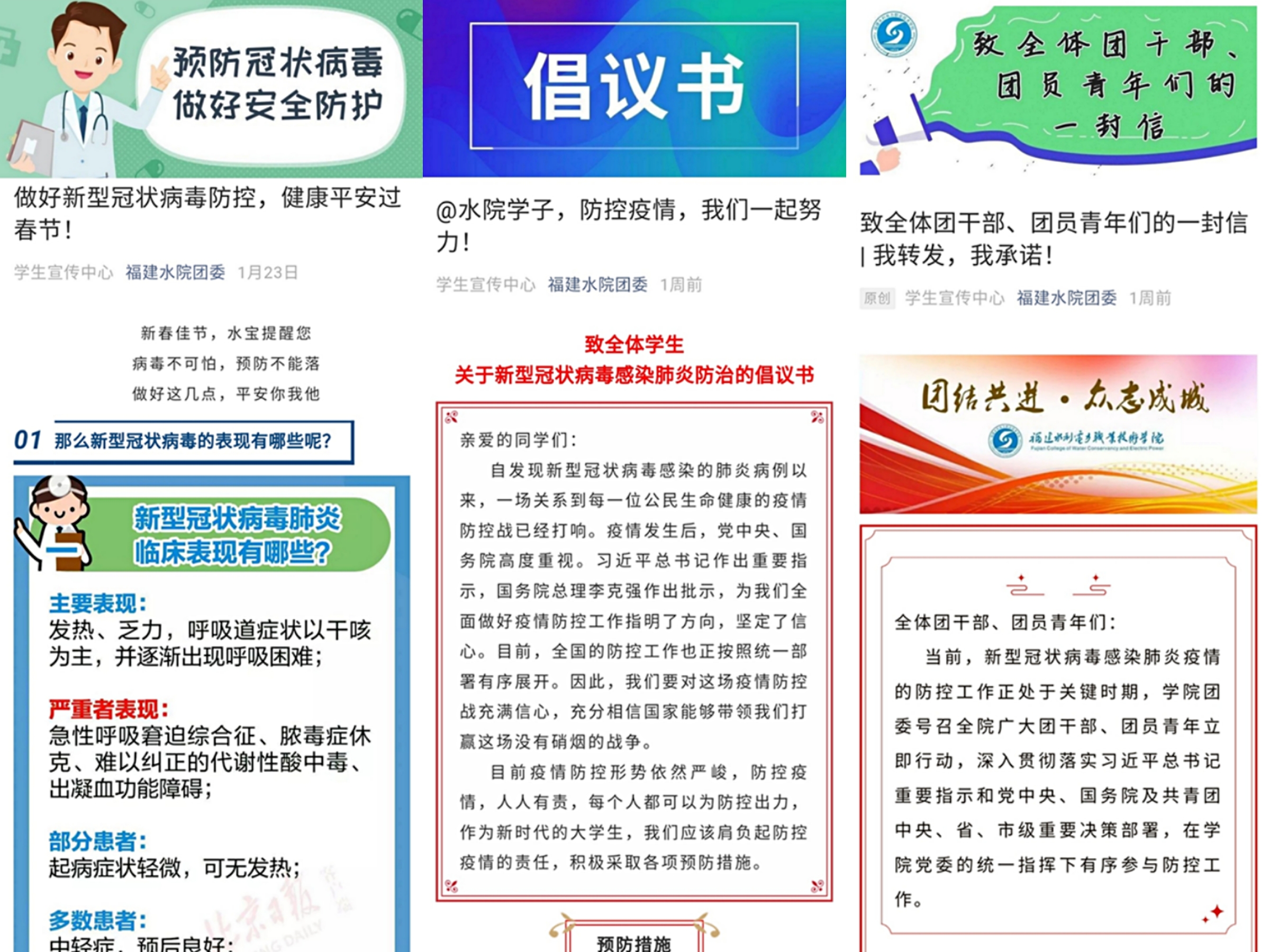 防“疫”有我,强化宣传教育共同防控。学生工作处、团委注重在学生中加强疫情防控知识宣传教育,充分发挥各级团学微信公众号、辅导员微信群、班级微信群等网络宣传阵地的作用,面向全体学生,及时推送校内外官方主渠道信息,以多种形式对学生进行思想政治教育,强化学生对疫情防控相关知识的学习,教育引导学生正确看待疫情发展,坚定战胜疫情的信心和决心。及时编辑推送“做好新型冠状病毒防控,健康平安过春节!”“ @水院学子,防控疫情,我们一起努力!”“致全体团干部、团员青年们的一封信”“致全体同学的一封信”等50多篇宣传教育引导材料;积极开展“防控有我,‘战疫’必胜网络直播主题团日活动”“快乐‘宅’生活短视频、照片征集活动”“武汉加油!中国加油!祝福视频传递”等网络连续互动活动,以原创文字、视频等更加生动形象贴近学生的形式科普防疫知识,让学生在辅导员老师和同学们的远程陪伴下“动起来”,规划假期,充电提升。