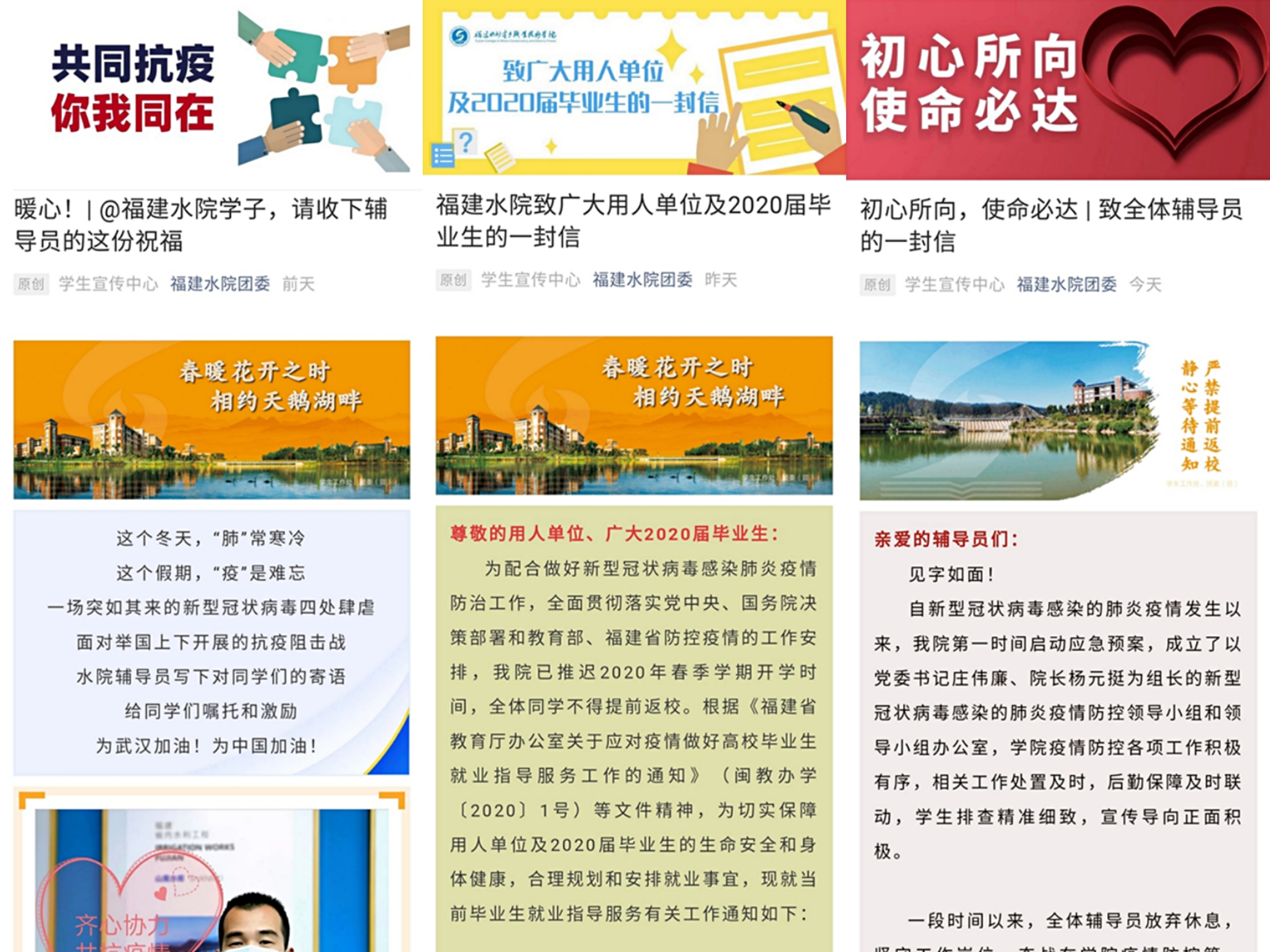 战“疫”关怀,搭好温暖之桥筑牢防线。开通心理支持热线电话和网络心理咨询服务平台,为在疫情中产生心理问题或需要心理服务的学生提供坚强有力的支持,让学生在疫情面前“笑起来”,用阳光心态为防疫保驾护航。在学院就业创业网、官方微信平台发布“致广大用人单位及2020届毕业生的一封信”,合理规划和安排就业工作服务事宜,切实保障用人单位及毕业生的生命安全和身体健康。开启疫情临时困难补助绿色通道,为有需求的学生办理发放临时困难补助。在中国教育在线网推送“@福建水院学子,请收下辅导员的这份祝福”祝福贴,传递辅导员对同学们的嘱托和激励,引导同学们科学防控,健康生活。“初心所向,使命必达——致全体辅导员的一封信”致敬奋战在学院疫情防控第一线的辅导员老师们,勉励他们要把防控的责任扛在肩上,把学生的安危放在心里,把关心和爱心传递给每一个学生,共同交出一份让学校放心、让学生满意的“答卷”!