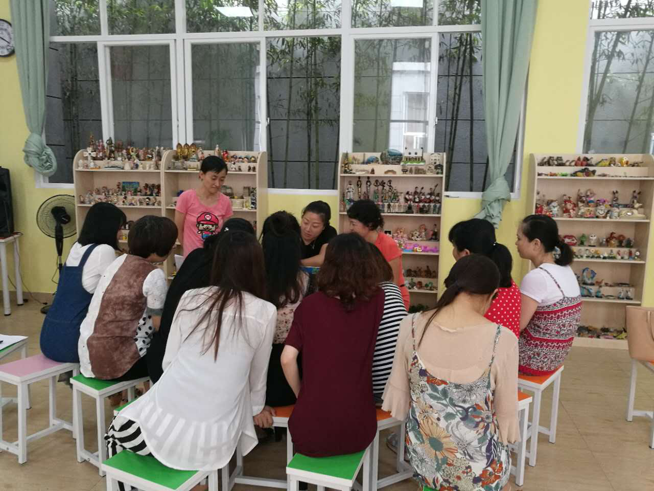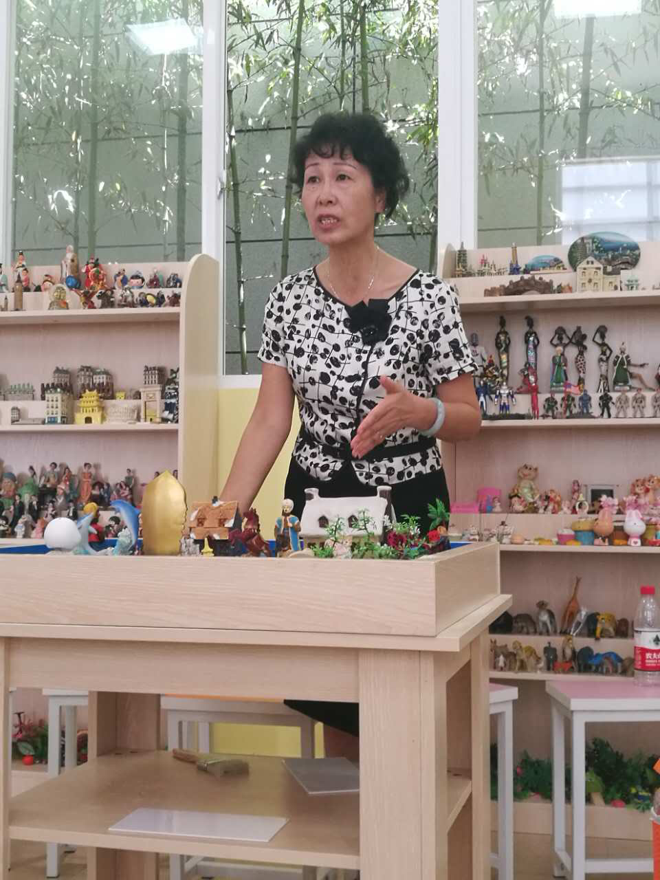 本次培训,既有箱庭疗法的理论学习,又有实际演练与操作。通过专业化的基础学习,让老师们了解到箱庭(沙盘)游戏疗法的理论取向、基本设置和注意事项:其基本过程是在咨询者的陪伴下,通过非言语的手段,让来访者从玩具架上自由挑选玩具,在盛有细沙的特制箱子里进行自我表现,再现其多维的现实生活,使来访者的无意识整合到意识中,即“无意识意识化”,是一种从人的心理深层面来促进人格变化的心理治疗方法。在实际操作和演练中,陈老师运用其10余年的箱庭实践经验,展示了如何营造一个处于自由、接纳和安全的空间保护,使得来访者的“自我治愈力”得以发挥。在她的引导与带领下,老师们充分地进行了个体箱庭、团体箱庭和家庭箱庭的创作、演示和体验。
