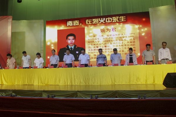 会议伊始,与会人员一同缅怀了在5月2日凌晨火场救险、英勇壮烈牺牲的消防官兵姚为君烈士并默哀。姚为君,系我院建筑工程系建筑1332班学生,2013年9月入学,2014年9月投笔从戎,成为一名武警消防战士,学院决定追授姚为君同学为学院“十佳学生”和“十佳团员”荣誉称号。