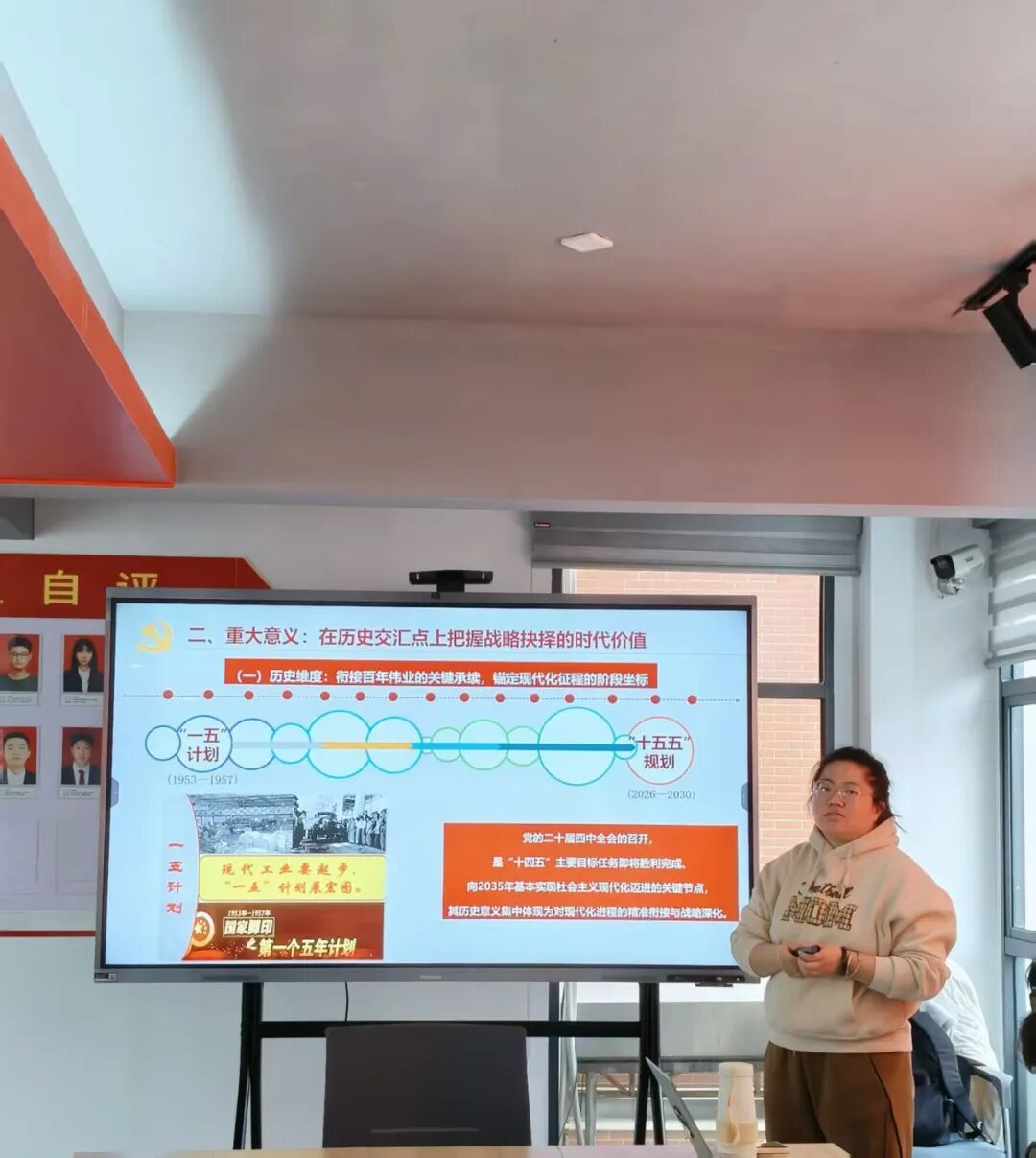 宣讲现场,李梦诗老师以生动鲜活的语言、翔实具体的案例,从党的二十届四中全会召开的时代坐标切入,深刻阐释了全会在全面建设社会主义现代化国家、实现第二个百年奋斗目标关键节点上的战略意义,并用一组组亮眼数据展现“十四五” 期间的发展成就,让同学们切实感受到“中国之治”的磅礴力量。