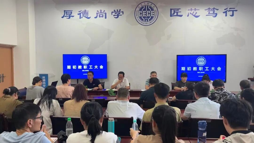 9月2日,信息工程学院于禹兴园1-210召开期初教职工大会。学院党政班子及全体教职工参加会议,会议由党政办主任陈旭林主持。 会议伊始,副院长吴良斌总结了2024-2025年度学院教学成果,并对新学期教学、跟岗实习等方面工作进行安排。最后,党总支书记朱庆喜从师德师风、安全教育管理等方面对本学期工作做出部署和动员。 本次会议为全体教职工明确了工作方向和目标,凝聚了学院职工的共识,紧紧围绕了学校和学院的工作重心。...