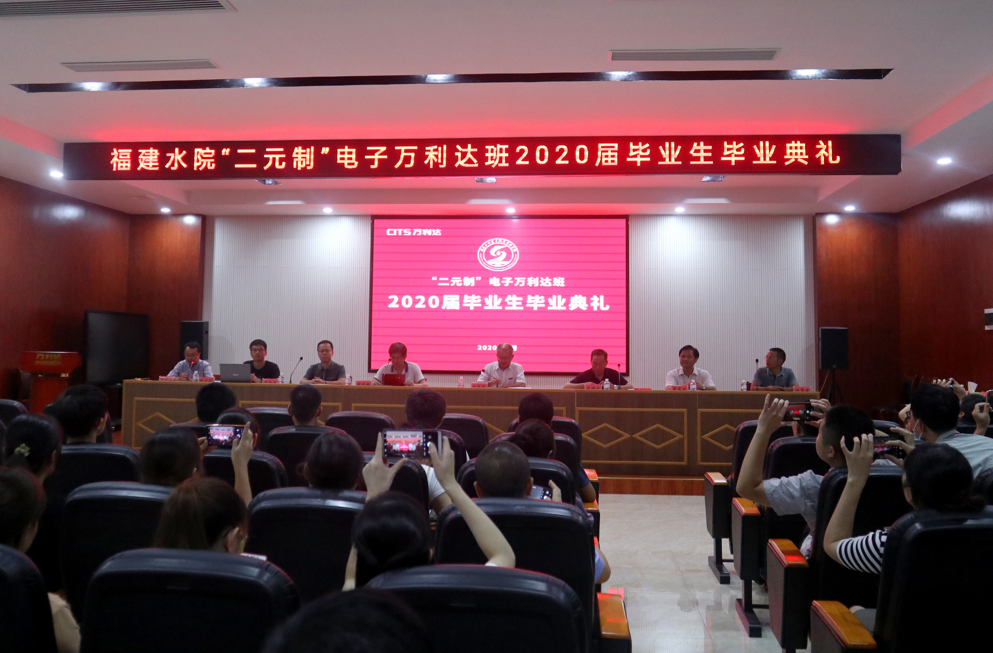 7月17日下午,福建水利电力职业技术学院2020届“二元制”电子万利达班毕业典礼在漳州万利达科技有限公司隆重举行。学院副院长池长全、信息工程系副主任翁祖乐,漳州万利达科技有限公司董事长赖建榕、党委书记宋祥官,南靖第一职业技术学校戴东升校长以及电子万利达班2020届全体毕业生、员工代表共计150余人出席典礼。公司党委副书记王鹏山主持典礼。