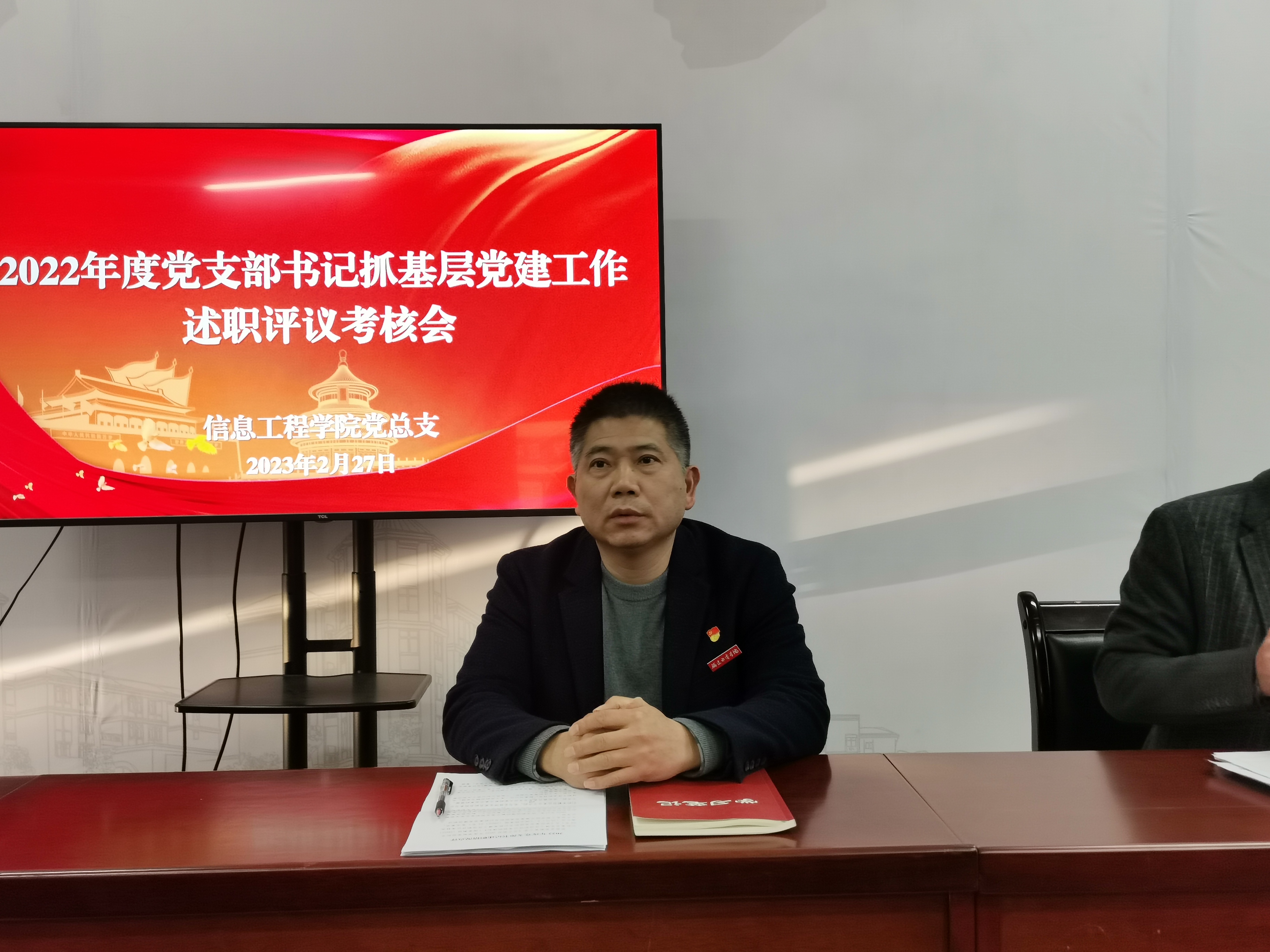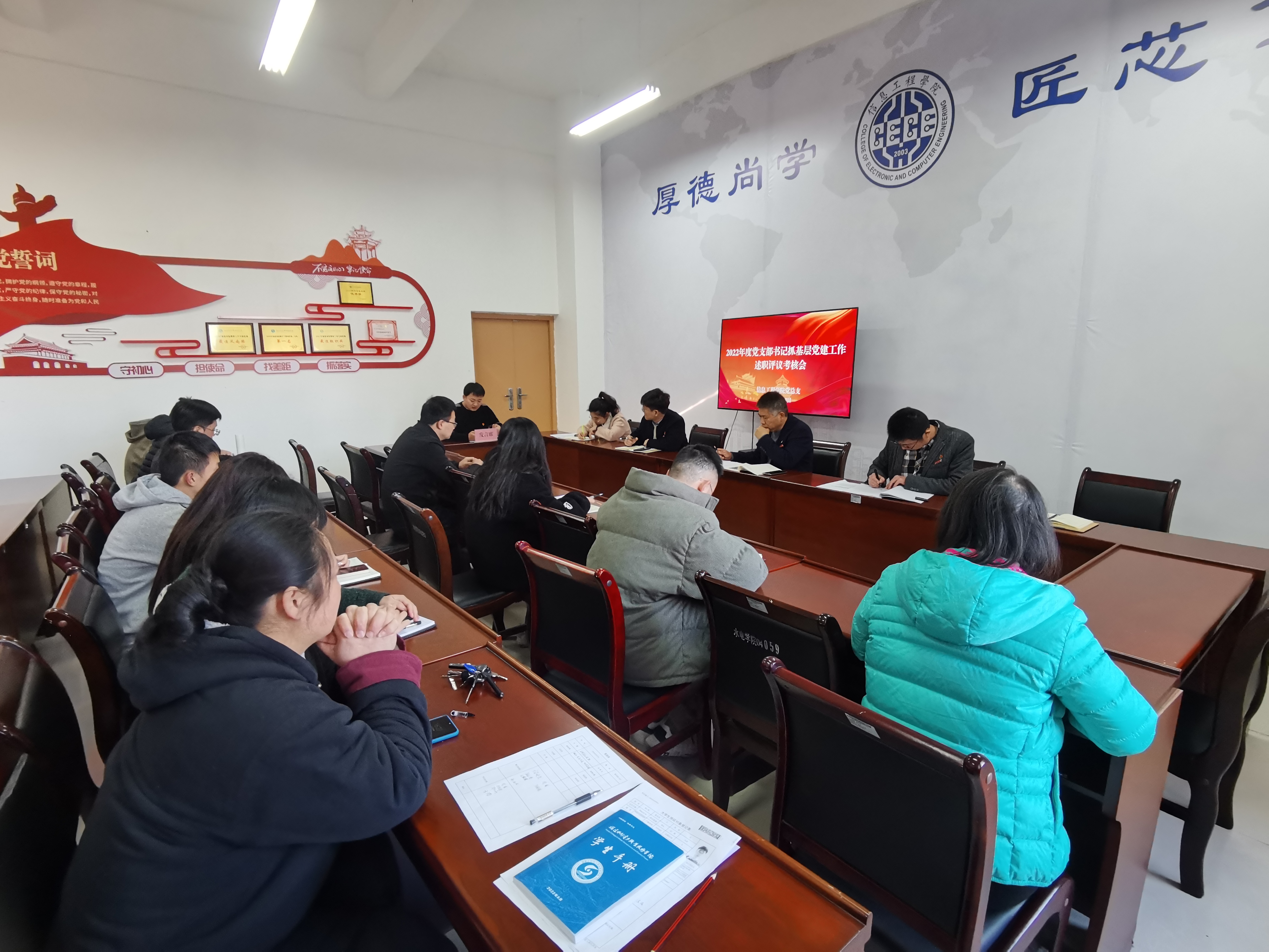 2月28日,我院召开党支部书记抓基层党建工作述职评议考核会,学院党总支书记朱庆喜及其他党政班子成员、教职工党员代表、非党员教师代表、学生党员代表等参加本次会议,会议由学院党总支专职组织员叶纯敏主持。