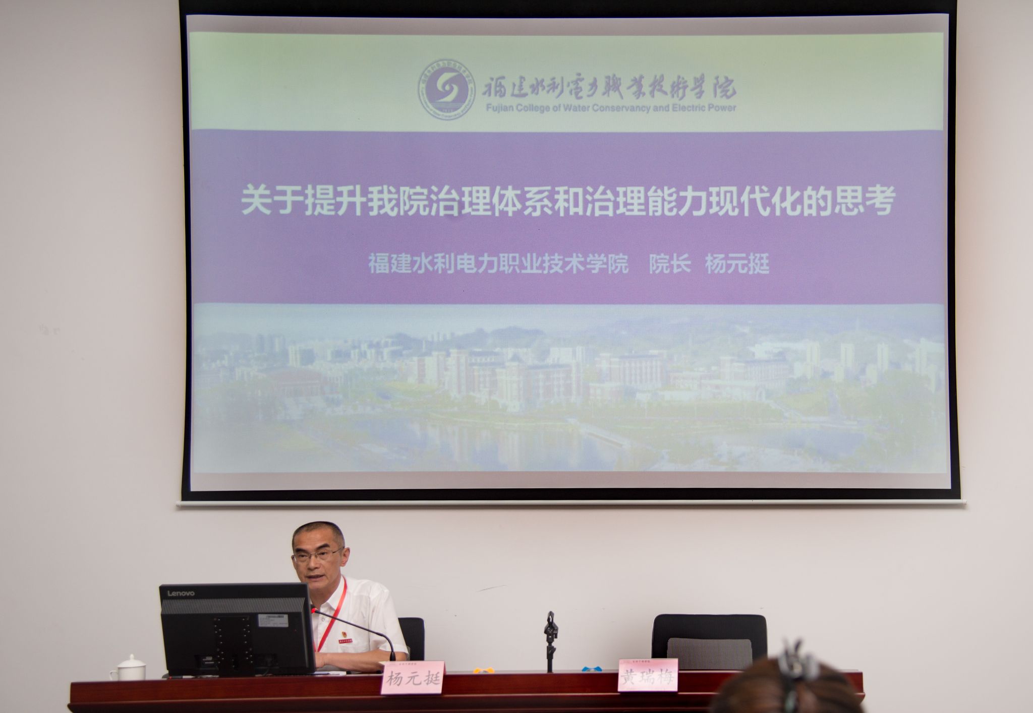 随后,学院院长杨元挺作了《关于提升我院治理体系和治理能力现代化的思考》专题讲座。他首先对大学治理体系和治理能力现代化、学院治理体系概况进行阐述,以刀刃向内之势深刻剖析了我院在“多元治理、教授治学”、制度体系、管理运行机制、治理手段、信息化建设、评价监督体系以及人力资源管理等方面存在的问题。接着,他从明确发展目标、制定学院愿景,加强计划能力、提高执行能力,聚焦人力资源、构建核心竞争力等三个方面为我院治理体系和治理能力现代化建设提出针对性意见。